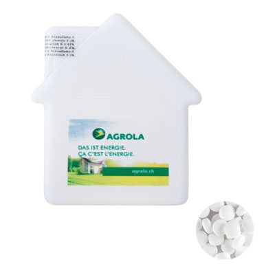 Dispenser personalizzato, a forma di “Casa” con caramelle alla menta con zucchero.
