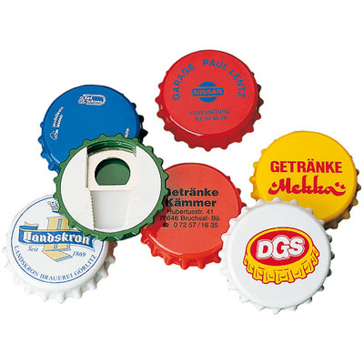 Apribottiglia personalizzabile, forma rotonda in metallo e plastica colorata.