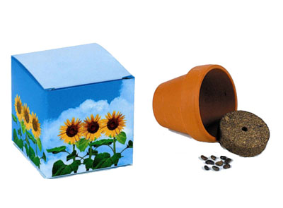 Box in cartoncino con piccolo vaso di terracotta, terra compressa e semi di girasole mini.