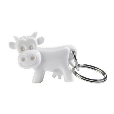 Portachiavi forma Mucca personalizzato, materiale in Acrilato di qualità con anello standard in Acciaio anodizzato, in 4 colori standard trasparenti e 6 colori solidi.