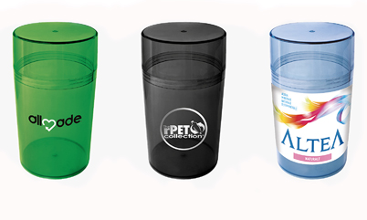 Possibilità di combinare le due parti del contenitore Mix&Match con colori standard o colori a Pantone trasparenti