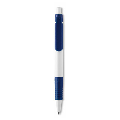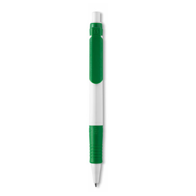 Penna a sfera a scatto in plastica ecologica PLA NatureWorks con fusto colore bianco solido, clip e grip 6 colori assortiti.