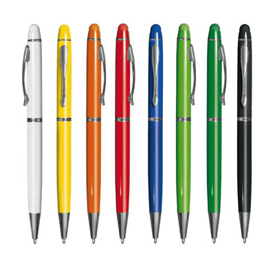 Penna a sfera con meccanismo a rotazione, fusto in metallo laccato colorato.