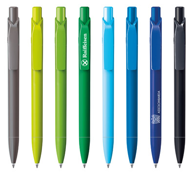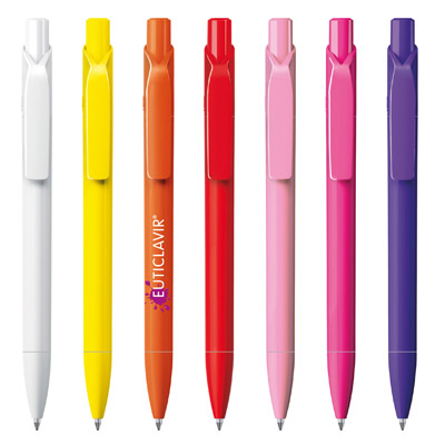 Penna a sfera a scatto in plastica colori solidi e finitura lucida.