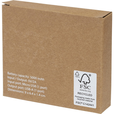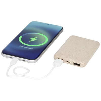 Powerbank personalizzato, leggero e compatto realizzato con un mix di Plastica 50% e Paglia di Grano 50%, doppia uscita USB per ricaricare 2 dispositivi in contemporanea.
