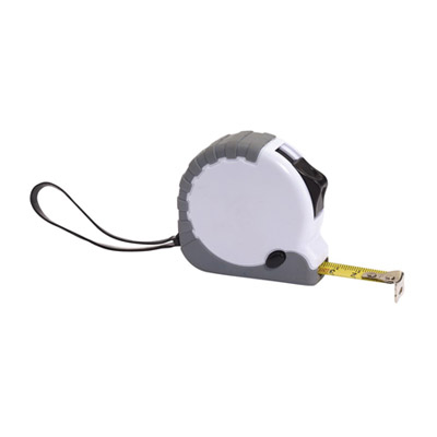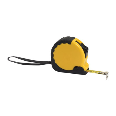 Flessometro in plastica e acciaio con nastro in acciaio 3 metri colore giallo, pulsante di riavvolgimento automatico con funzione di blocco. Clip per aggancio su cintura e cordino.